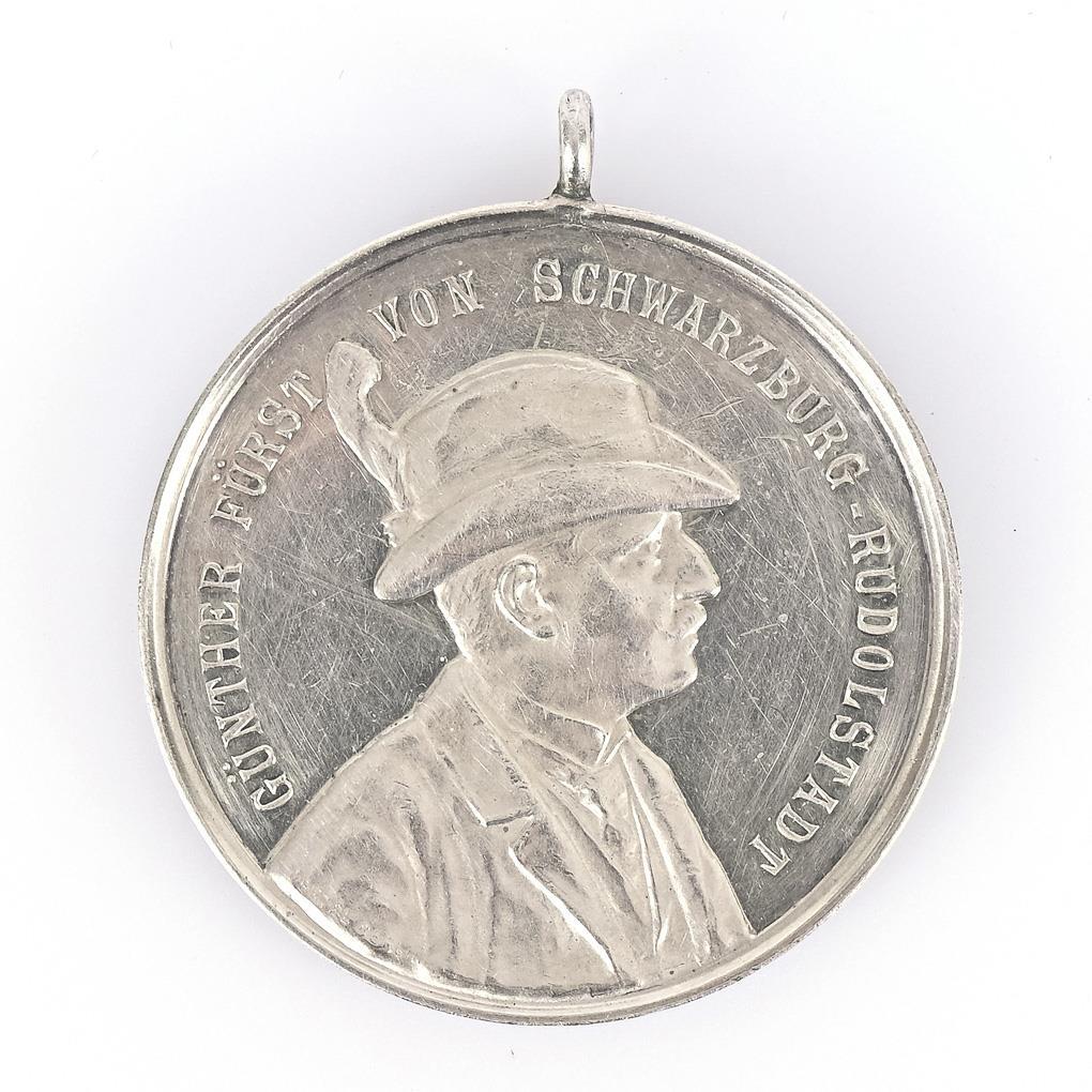 "XII. Thürg. Bezirks-Schiessen Rudolstadt 1-4 June 1902" and view of a castle complex. / "Günther Prince of Schwarzburg-Rudolstadt" with hat, looking to the right. With eyelet.
