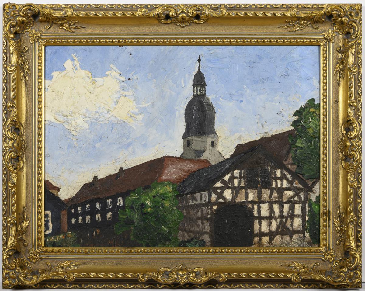 City view with manor houses in front of the church tower under slightly cloudy sky. Light traces of age.