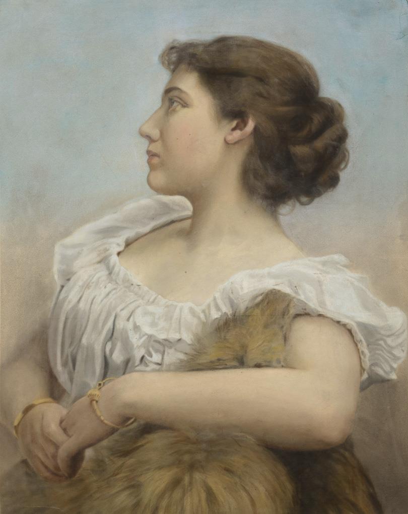 Quality portrait of a young woman in white dress with fur. Slight creases and tears in two corners.