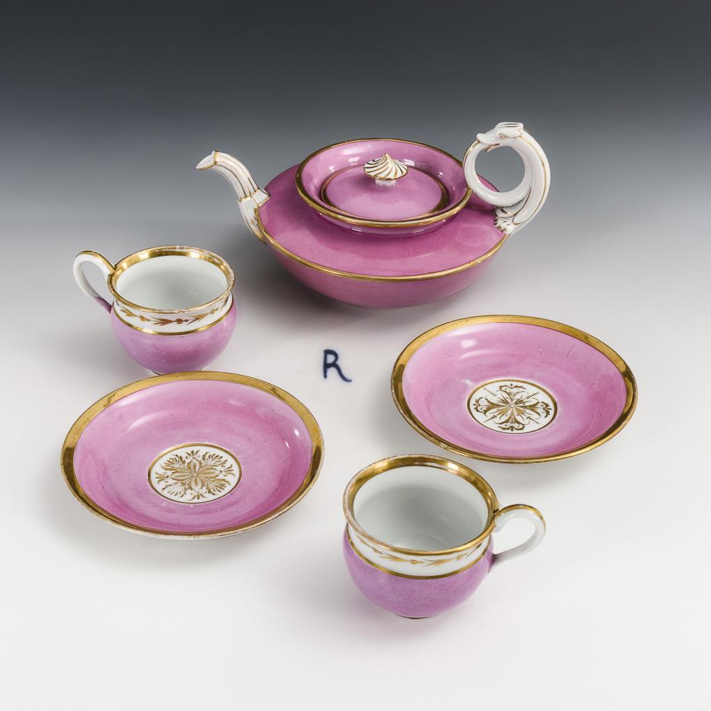 Elegant, pressed bulged teapot with high rolled animal head handle, tube spout and knob lid (h 11 cm), 2 earthenware cups (h 7,5 cm) with original saucers (Ø 13,5 cm). 1 handle with hairline crack, partial gold abrasion.