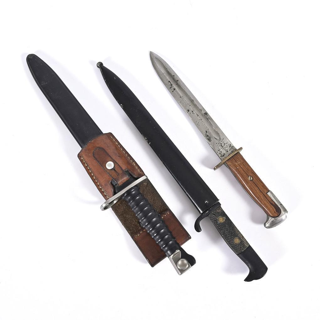 Swiss bayonet, "Model 1957", straight, double-edged blade marked "F+W" in circle, numbered. Black grip broadly ribbed. Plastic scabbard. Leather shoe marked "K. Rutishauser Sattlerei Frauenfeld 87". Total L 38 cm. / Probably dagger knife I. World War. Horn grip scales?, unmarked. Black metal scabbard fits, but probably does not belong to it. Total L 37 cm. / Probably rebuilt bayonet knife with wooden handle and probably supplemented stabbing blade. There engraved "S". L 30 cm.