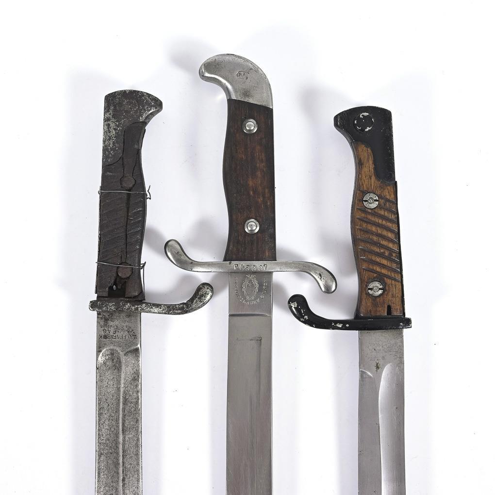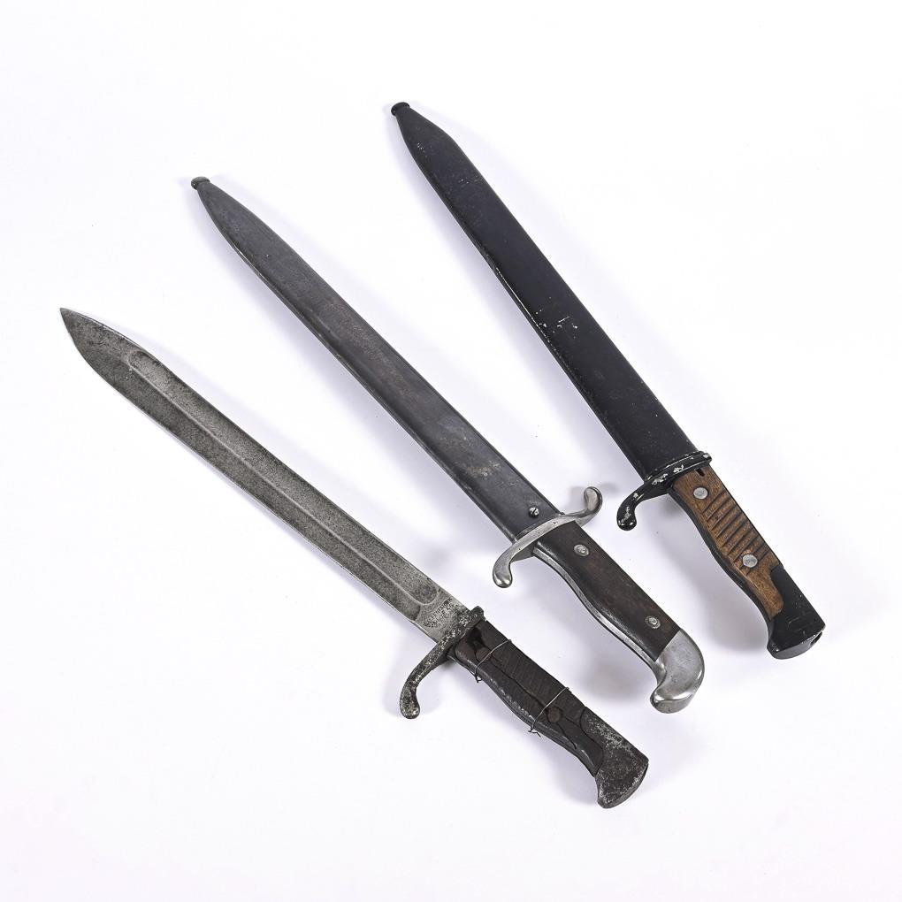 2x side arms model 98/05, probably Bavarian version with hole in the handle. Straight, single-edged blade with wider forepart, point in the centerline, wide hollow grind. One piece with light wooden grip scales, metal parts on grip and scabbard painted black, unmarked. Other piece with defective dark grip scales, metal parts preserved, with corrosion scars. Marked "Waffenfabrik ...RAG", on back crowned "W 16". L weapon 50 cm. / Argentina, "Modelo Argentino 1909", "Weyersberg, Kirschbaum & Co, Solingen". Blade as described above, grip with wooden scales, s-shaped quillons. Metal scabbard and weapon with identical numbering. Total L 52,5 cm.