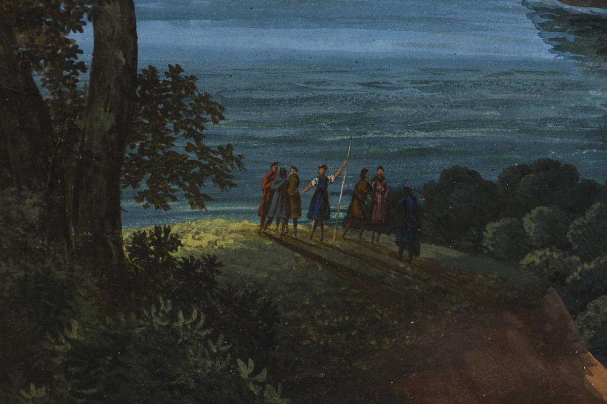 Mountainous coastal region with forts on the peaks under dark clouds. Tear, slight creases.