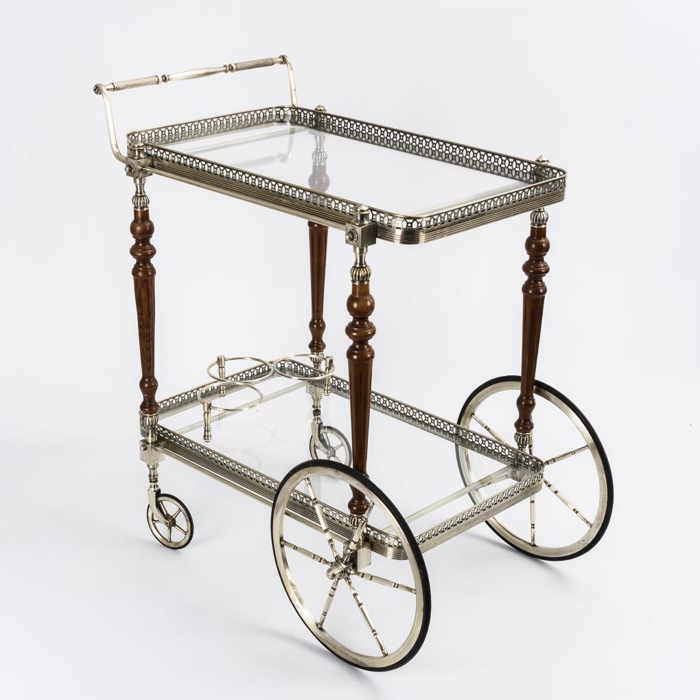 Elegant rolling tea trolley with metal frame on 4 fluted legs made of wood, with 2 small and 2 larger wheels, 2 shelves made of glass, 3 bottle holders. Light signs of age/use, traces of corrosion.