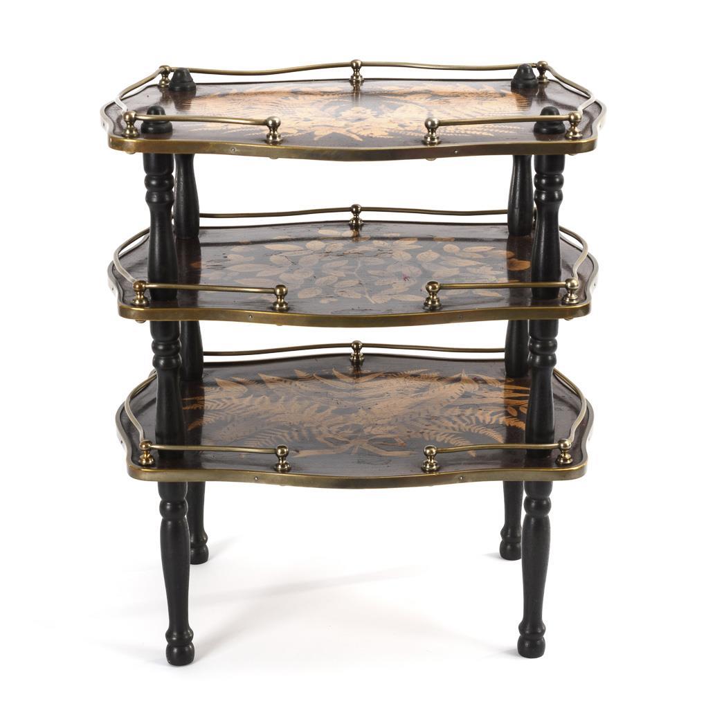 Small side table, each with railings on the 3 tiers; each with floral inlay look. 5 hat nuts missing, braces supplemented(?), little signs of age/use.