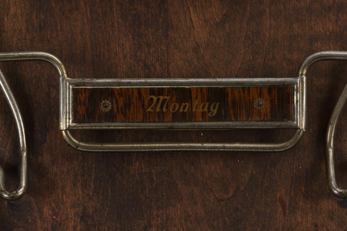 Wall board with 7 hinged holders; inscribed on them the days of the week. Above Art Nouveau decorative applique.