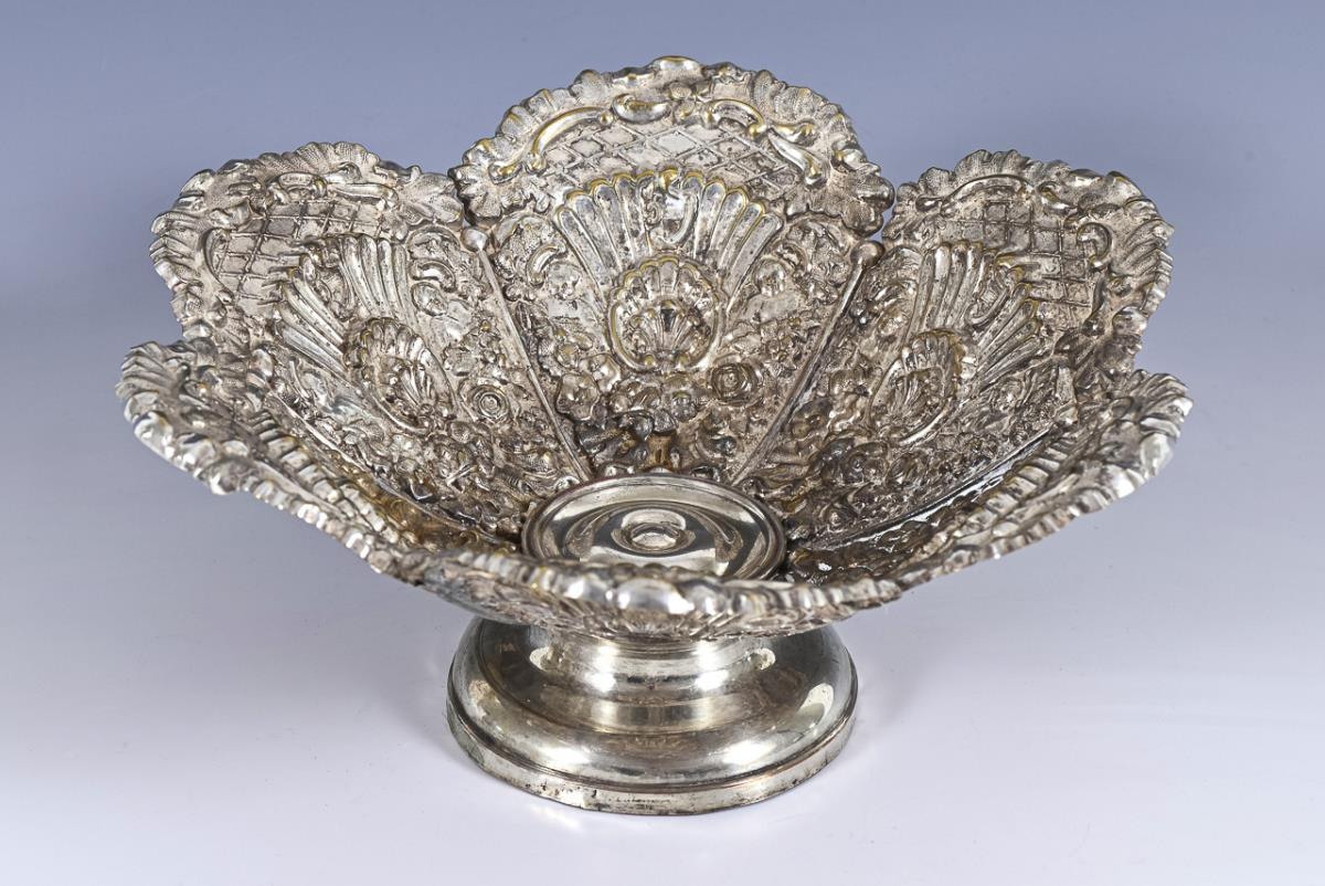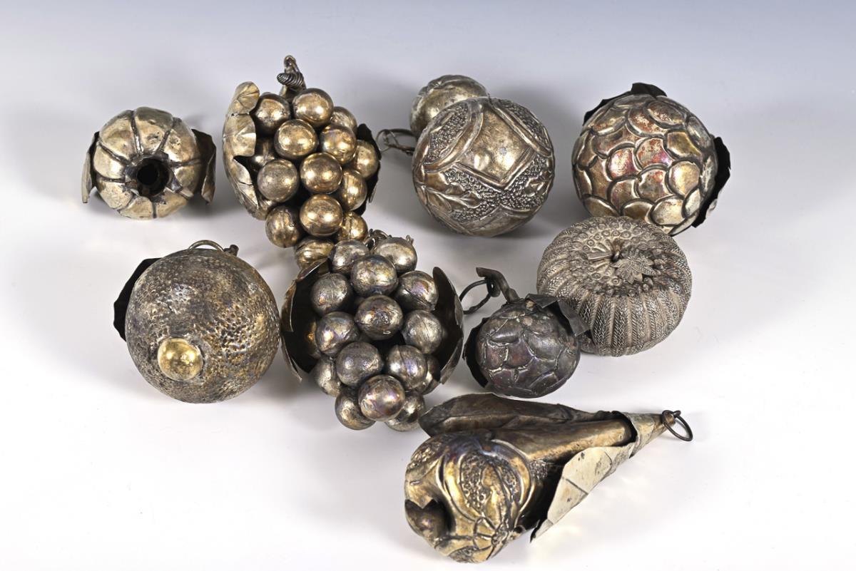Rich relief round footed bowl (h 10,5 cm, Ø 24,5 cm) and 9 metal fruits, including pomegranate, orange, grapes etc. Marks of age, partly small dents and soldered joints.