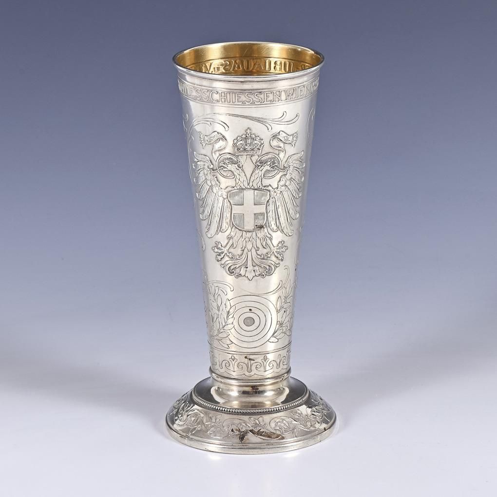 Conical cup with inscription: "Kaiser-Jubiläums- u. V. österr. Bundesschiessen Wien 1898. To the 50th anniversary of the emperor with relief double-headed eagle and crowned emperor monogram "1848 - 1898".