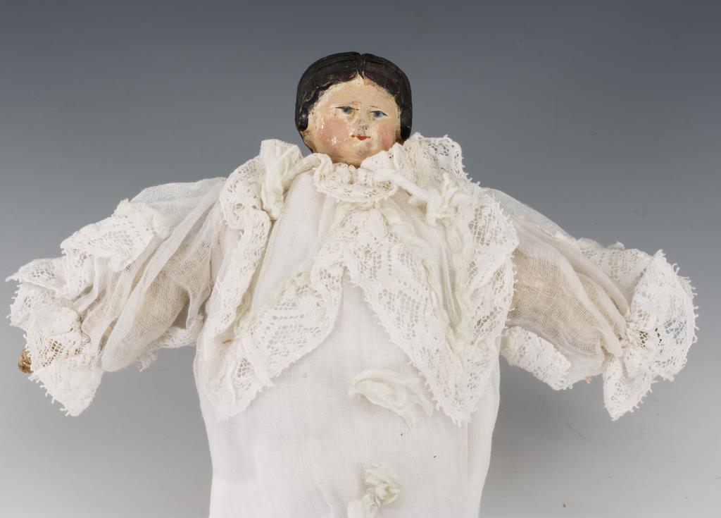Geschnitzter Brustkopf mit gemalten Augen, auf Leinenbalg mit Lederarmen. Weißes Nachthemd. In weißem Steckkissen. Kleine Farbbestoßungen am Kopf, teils retuschiert.