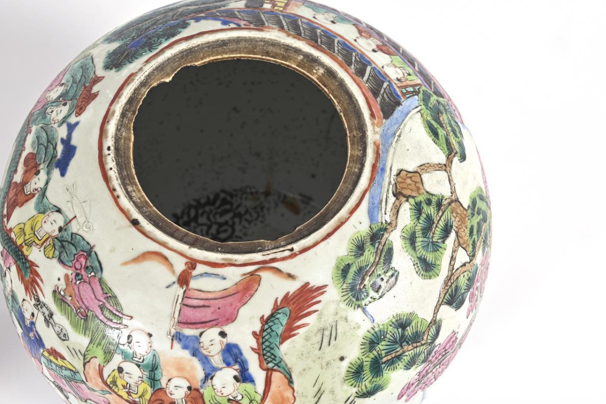 Square vase, marked with red stamp, painting in enamel colors and partial gold background. The missing lid is replaced by an old metal assembly, screwed by a rod in the bottom of the vase. H 33 cm. / Spherical vase without lid, with multi-figure scene of a children's party with boat ride and dragon dance. Old chips in the inner rim. H 20 cm.