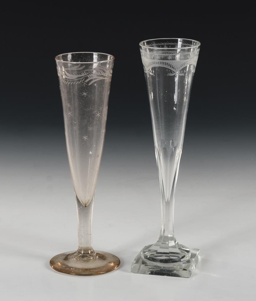 2 Empire champagne flutes with engraved borders, 3 different pillars, 1 Berliner-Weisse glass with white enamel rim. 1 champagne flute glass sick.
