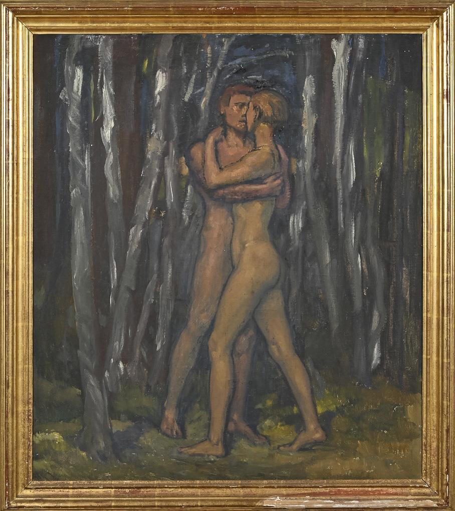 The kissing couple in dark forest between densely standing trees. Slight signs of age.