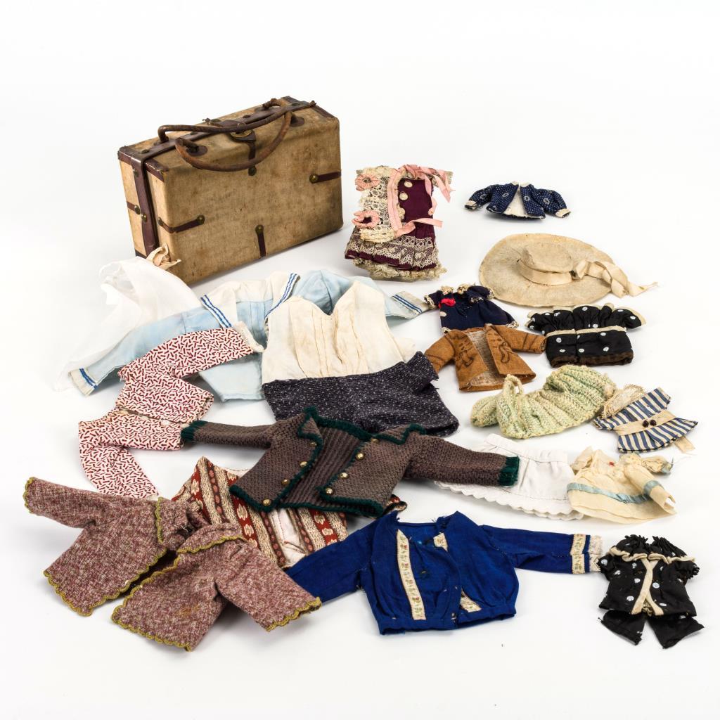 Ca. 19 Kleidungsstücke und 1 Hut, für sehr kleine bis mittlere Puppen. Kleiner stoffbespannter Koffer mit Lederbeschlägen. Altersspuren, kleine Defekte.
