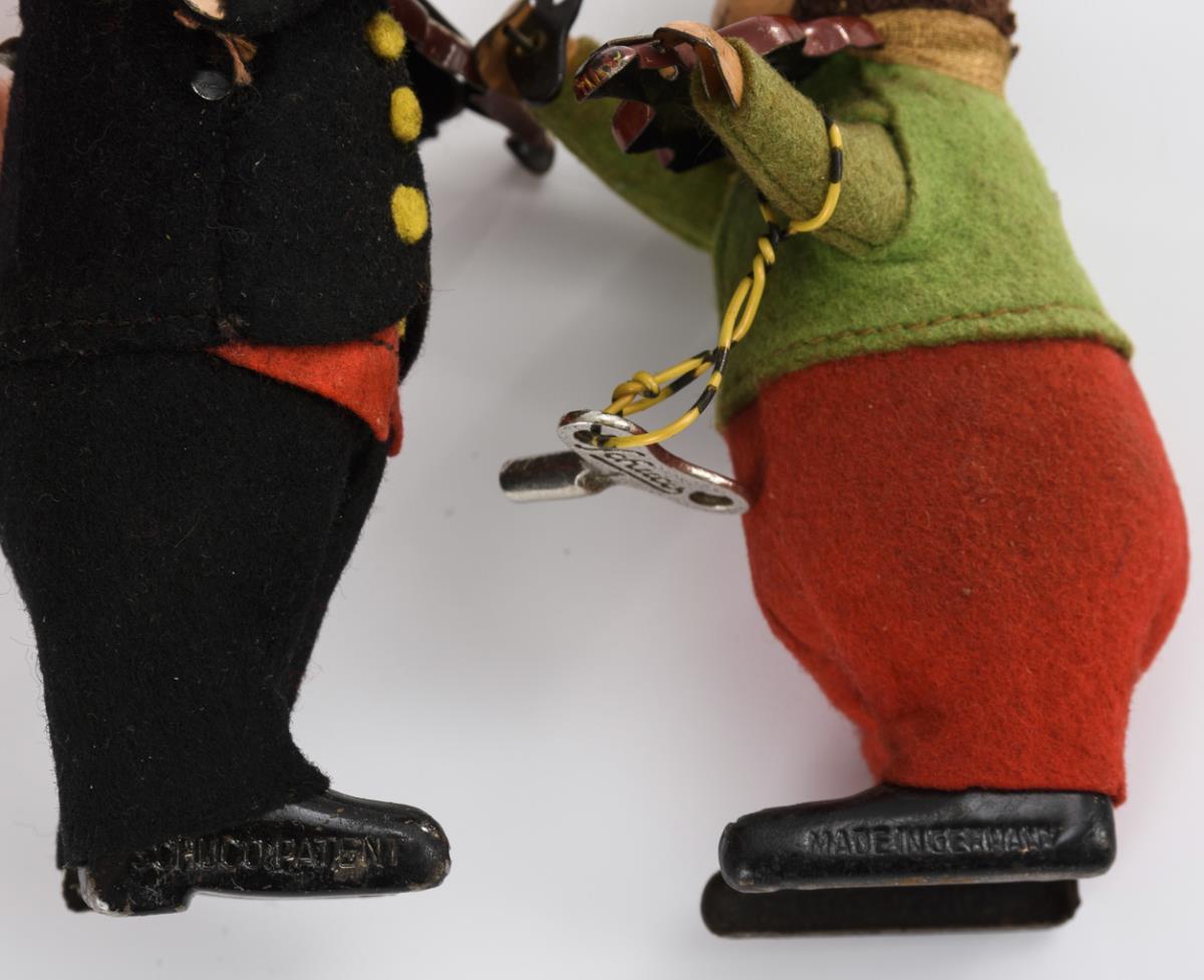 2 Schuco violinists (as a monkey and Dutchman with violin and violin bow) and velvet covered frog "Flipo 930" (1932-1975) / skier and dog (probably Blomer & Schüler). 4x intact movement, plus 3 keys. Traces of age, skier with defective movement.