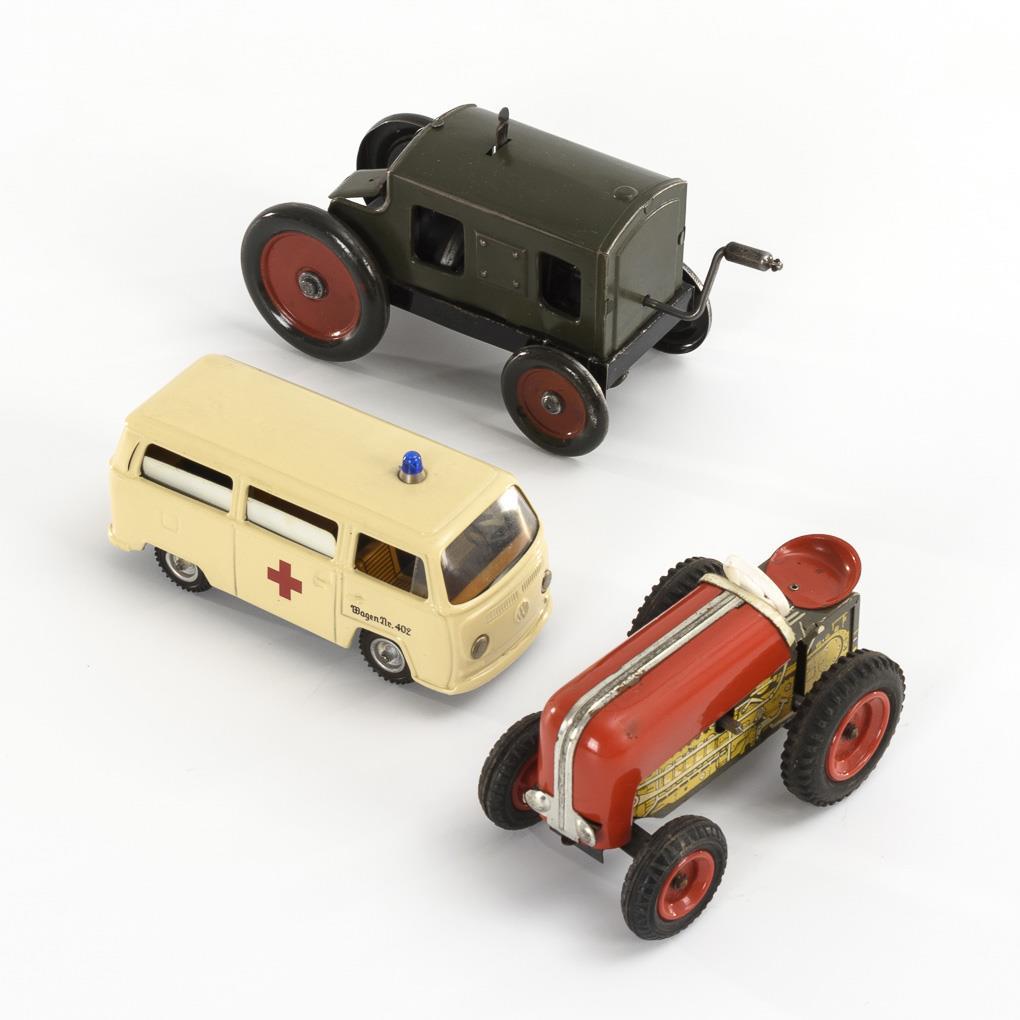 Red Porsche tractor with intact movement. L 11 cm. Simple olive green tractor with switchable flywheel gearbox. L 16 cm. / VW bus as ambulance no. 402 (Kellermann & Co), with friction drive. L 12 cm. Partly slight signs of play and age. Works intact.