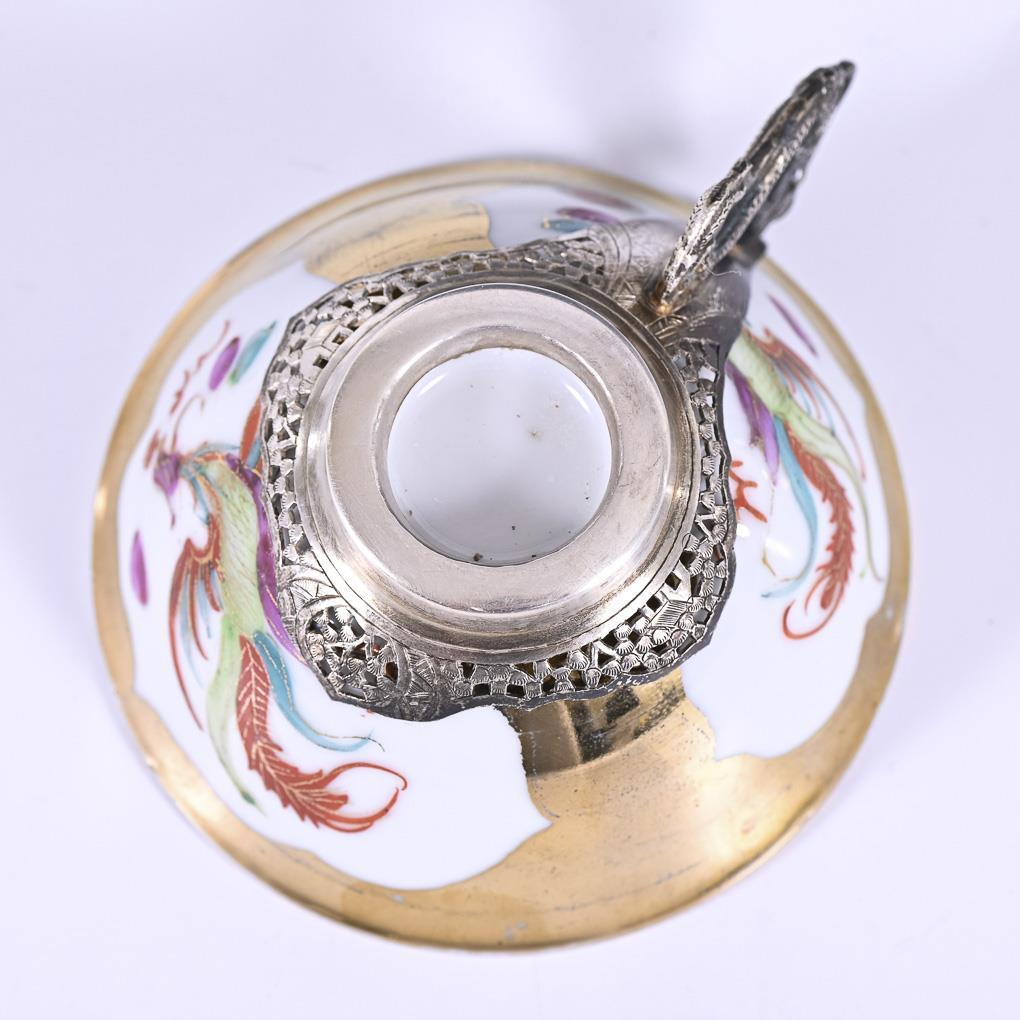 5 delicate porcelain cups with kite-shaped silver handles. Plus 5 silver saucers and 5 spoons. Gold background partly rubbed.