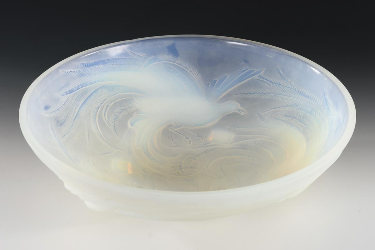 In the manner of Lalique designed large bowl with firebird relief. 1 small rim bump.
