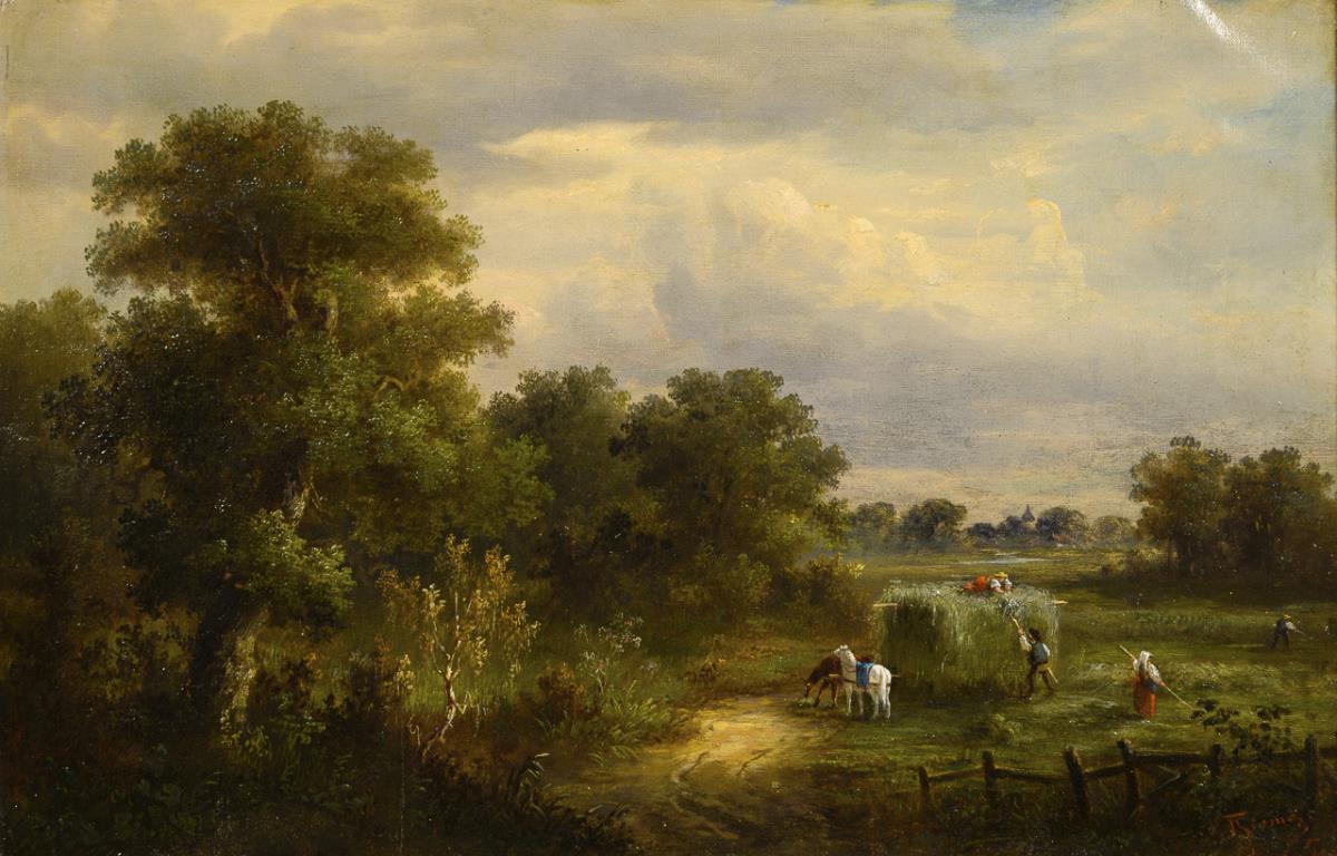 Peasants in the meadow harvesting hay at the edge of the forest in idyllic light. Minimal signs of age.