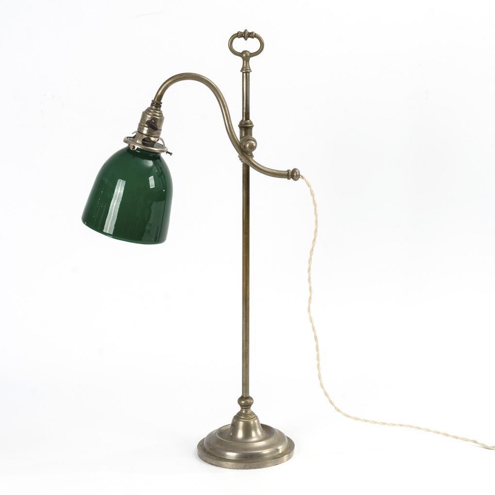 Nickel-plated brass, cast iron, green glass with white inner catch. H 63 cm.