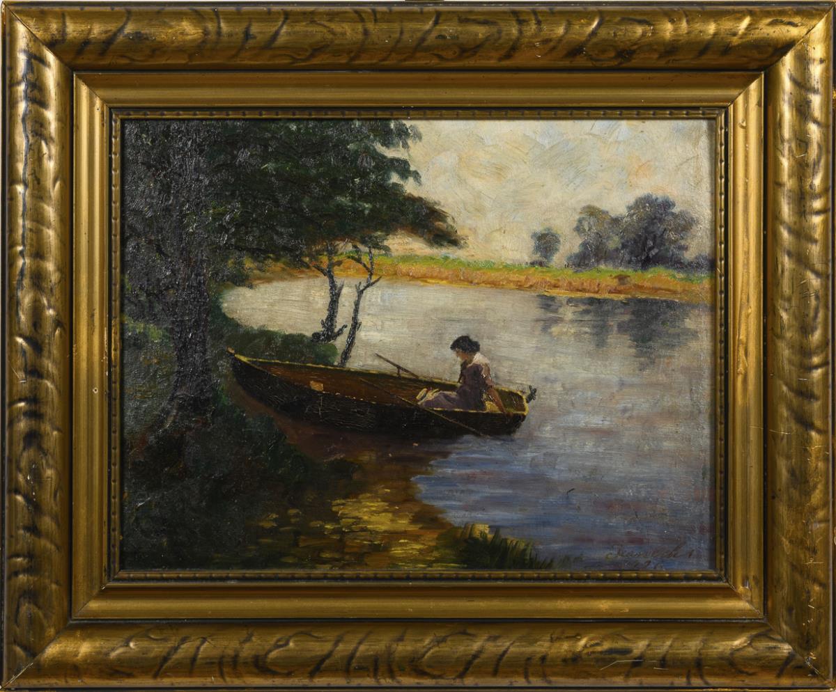 Lakeside with a young woman in a boat in sunny weather. Slight signs of age.