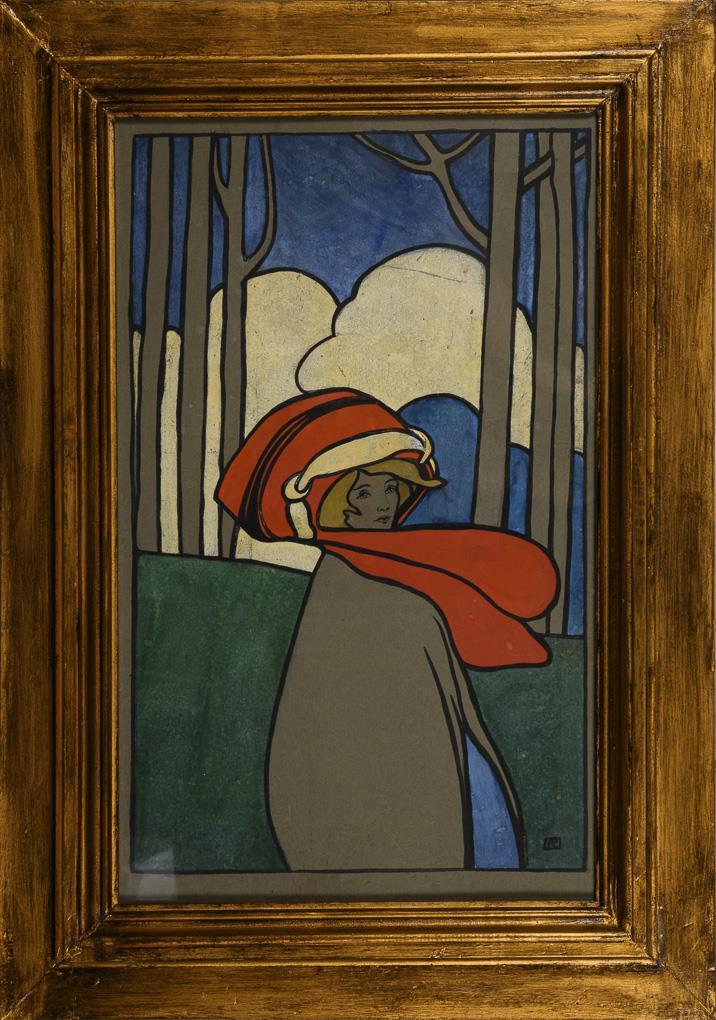 Young woman in gray coat with red hat on a meadow with slender trees. Minimal signs of age.