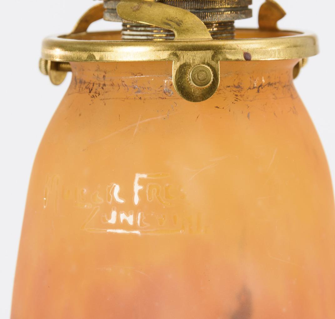 Colorless glass with orange and blue powder fusions, frosted. H 42,5 cm.