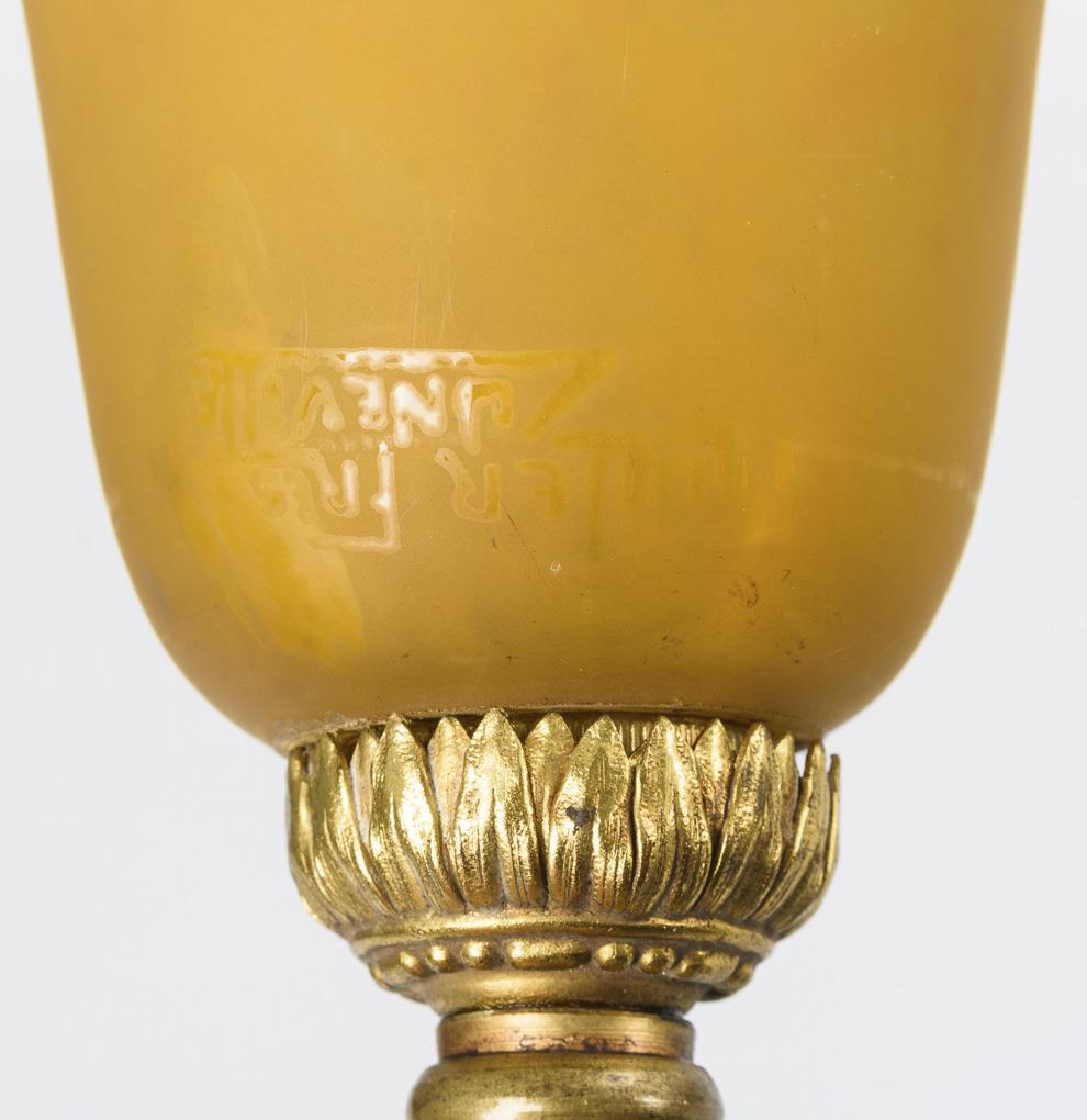 Bell-shaped shade of colorless frosted glass with yellow, red and blue powder fusions. On bronze base with fluted and leaf relieved stem and round base. Electrified.