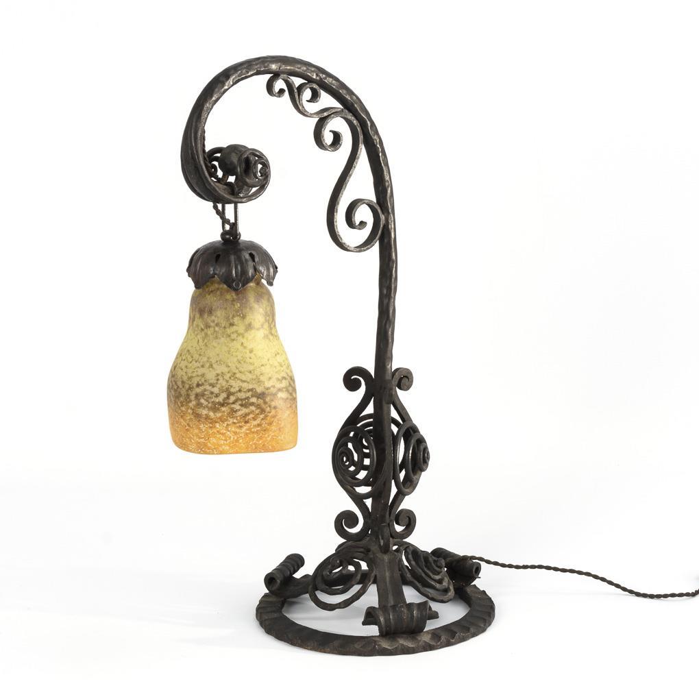 Bell shade (h 15,5 cm). Suspended from a wrought iron base with a high, curved arm and volute decoration on the shaft and round base. Old electrified (function not tested).