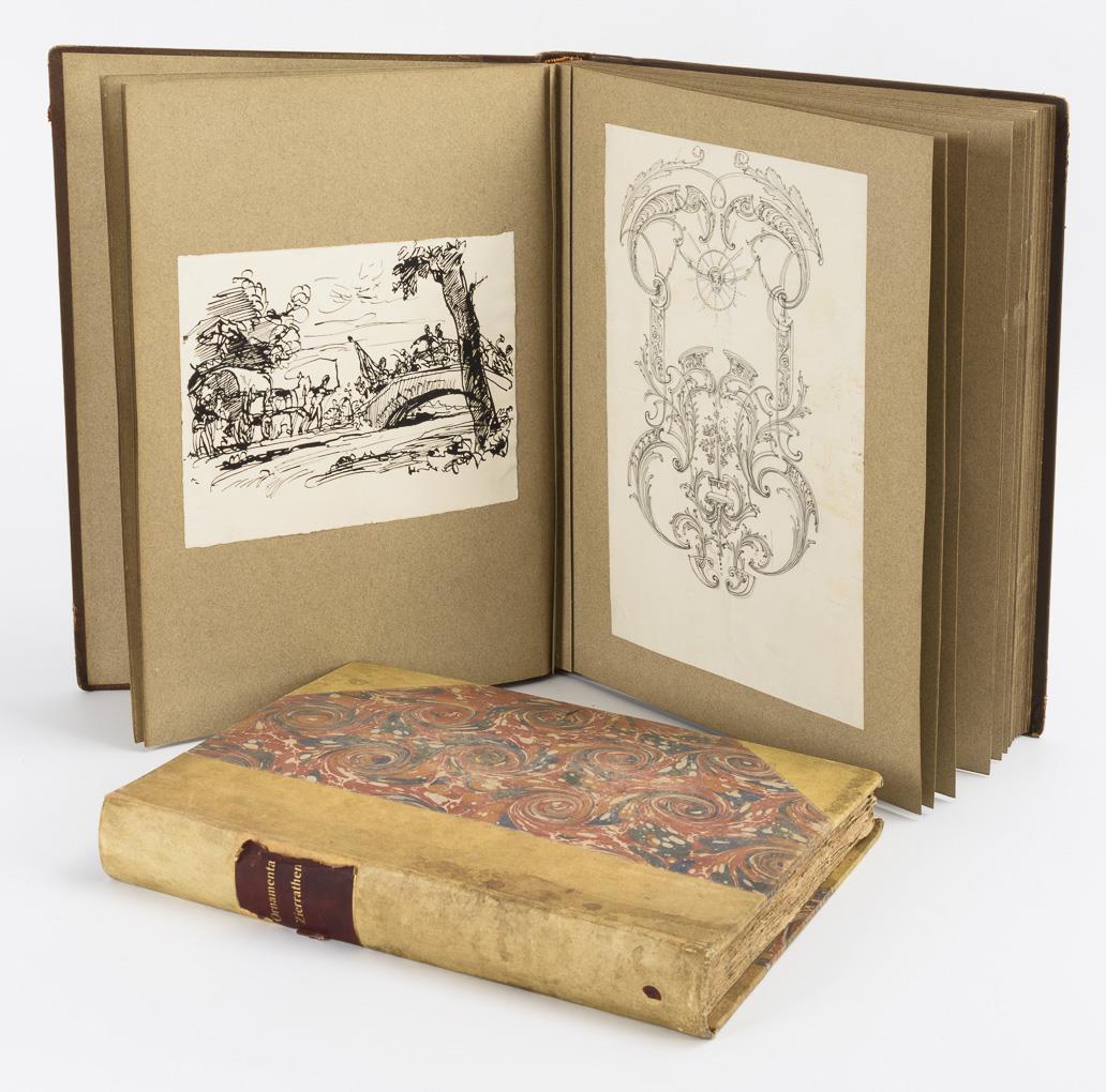 Quality sketches mainly on furniture, but also animals, genre scene and architecture. The Ornamental Zierrathen include various motifs to saints, epitaphs, floral ornaments, genre scenes mainly in copperplate engraving. Few creases.