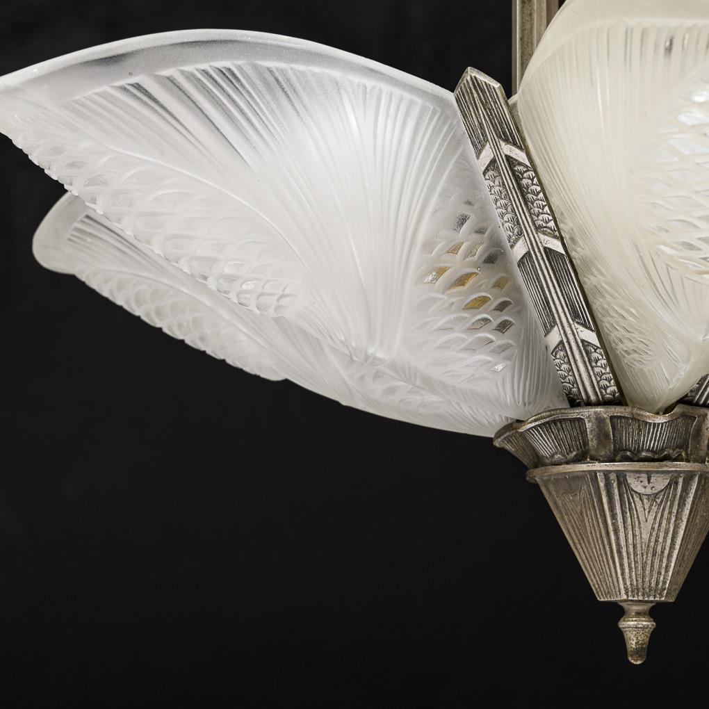 6-flame hanging lamp with frame of 6 central struts and plate canopy, flower-shaped designed glass shade of 6 individually inserted, organically shaped glass plates. Metal with traces of corrosion, glass plate edge partly with chips.