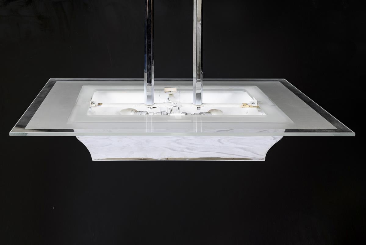 Timeless 4-flame hanging lamp (originally for a billiard table) with cuboid hollow metal body on 2 central struts, with rectangular canopy, body with frosted glass insert and protruding, removable rectangular glass plate. Inside later painted white, metal struts with traces of paint, slight signs of age / use.