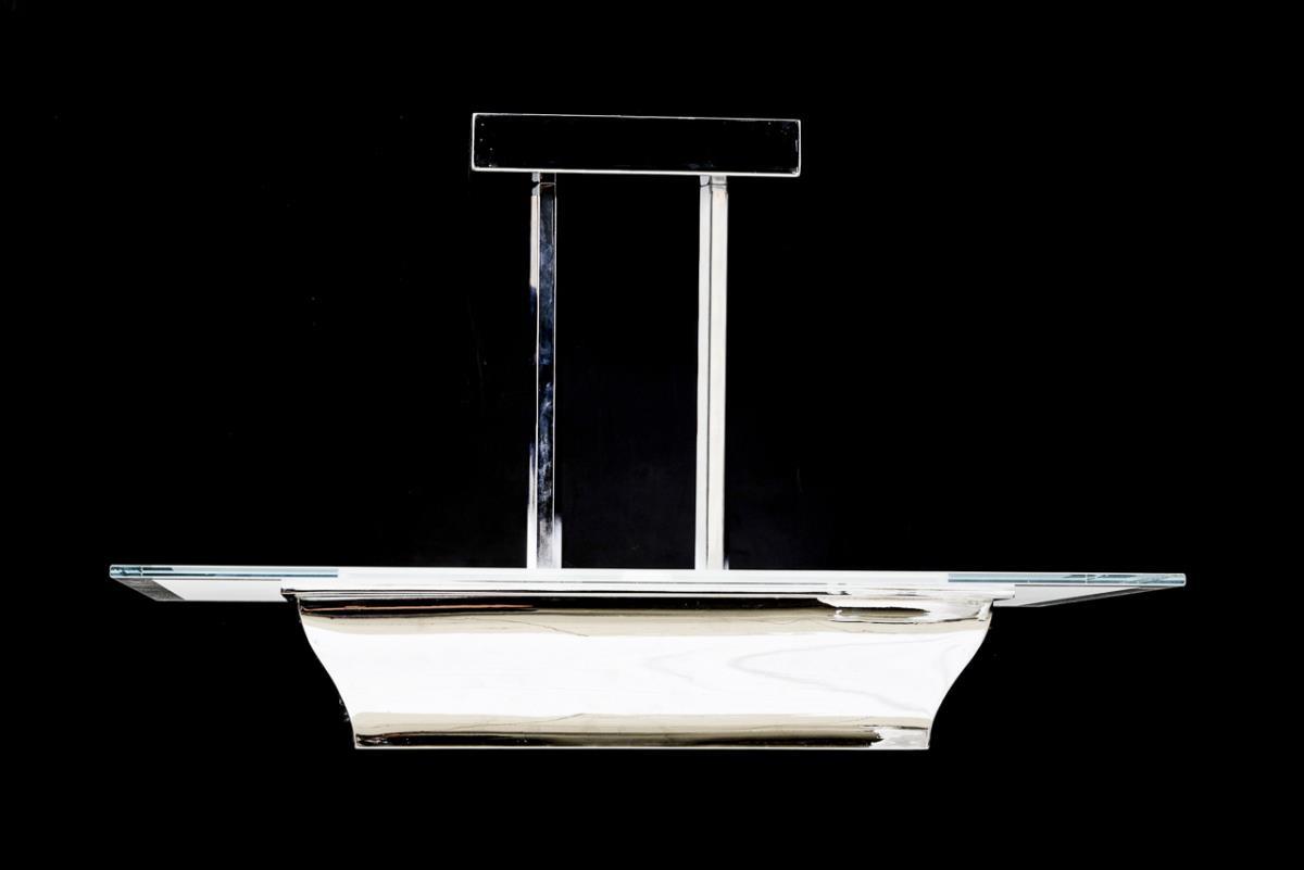Chromed metal, partly sandblasted glass. H approx 54 cm, L approx 85 cm, W approx 50 cm.