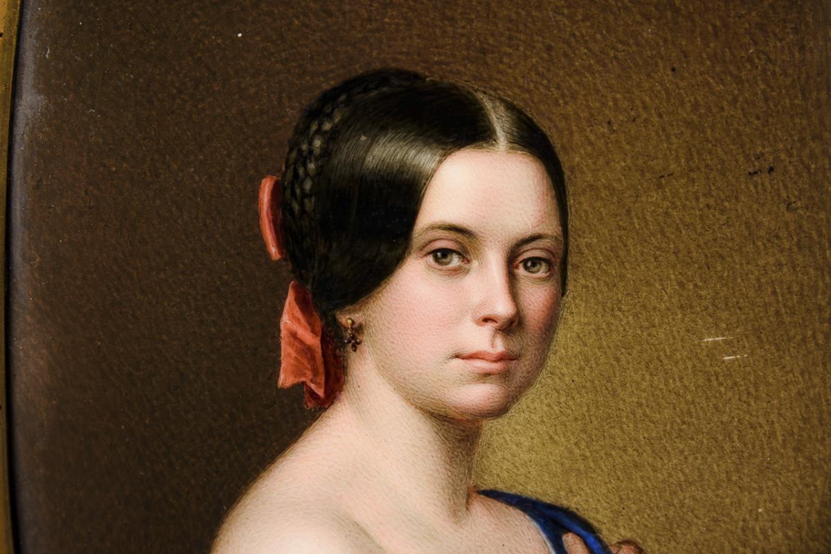 Polychrome painting. 14 x 10.5 cm, in brown, velvet-covered passe-partout frame.