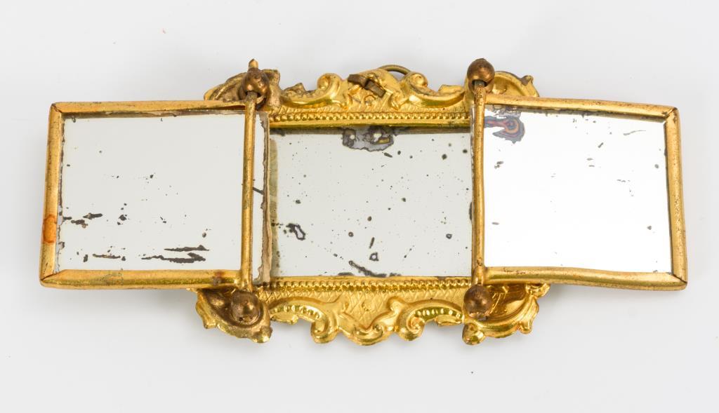 Kleiner Rahmen, außen mit Winterszenen. Innen Spiegel mit 2 Klappflügeln. Kleine Blindstellen im Spiegelglas.