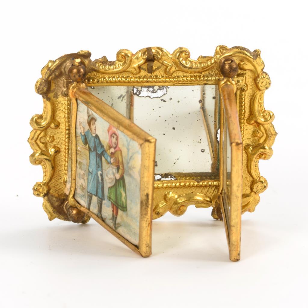 Goldblech, Spiegelglas, Farblitho.4,5 x 6 cm, B aufgeklappt 10 cm.