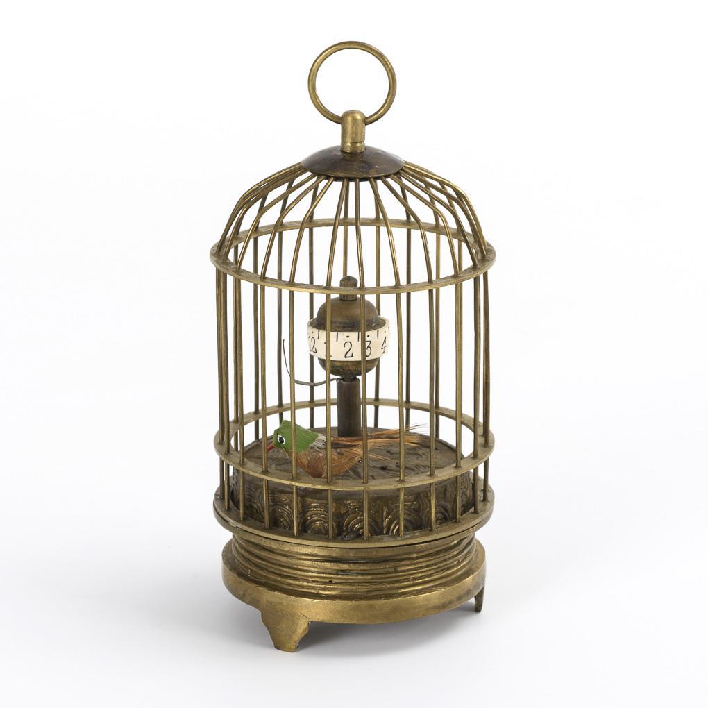 Small table clock as a hanging birdcage. A rotating hour and half-hour display with Arabic numerals in the center of the cage, a small bird.