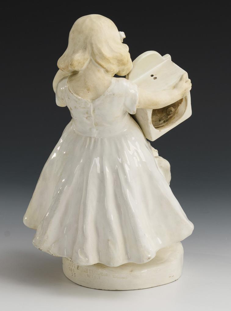 A girl holding a shield clock with playing cat, on round base. Without clock. Restored at the dress hem, cat's tail and base.