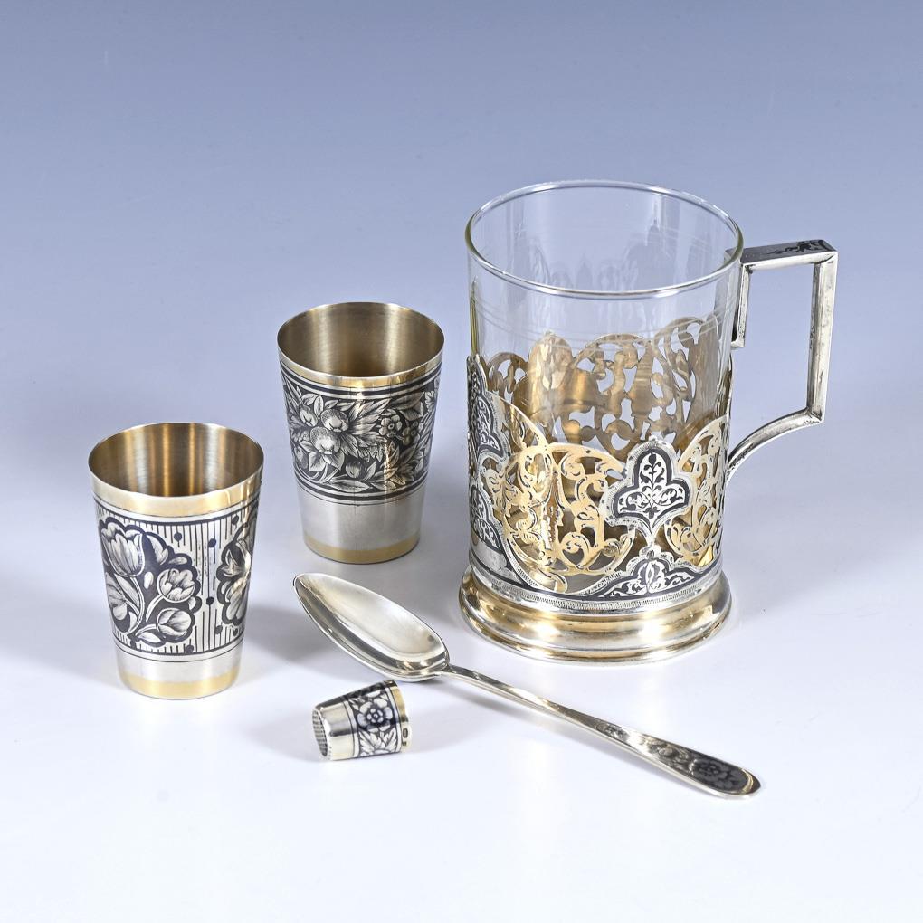 Tea glass, 2 vodka cups, thimble and spoon. Decorated in niello technique. Scarcely signs of use.