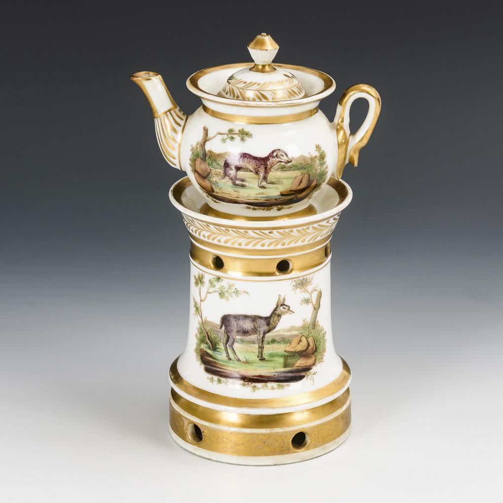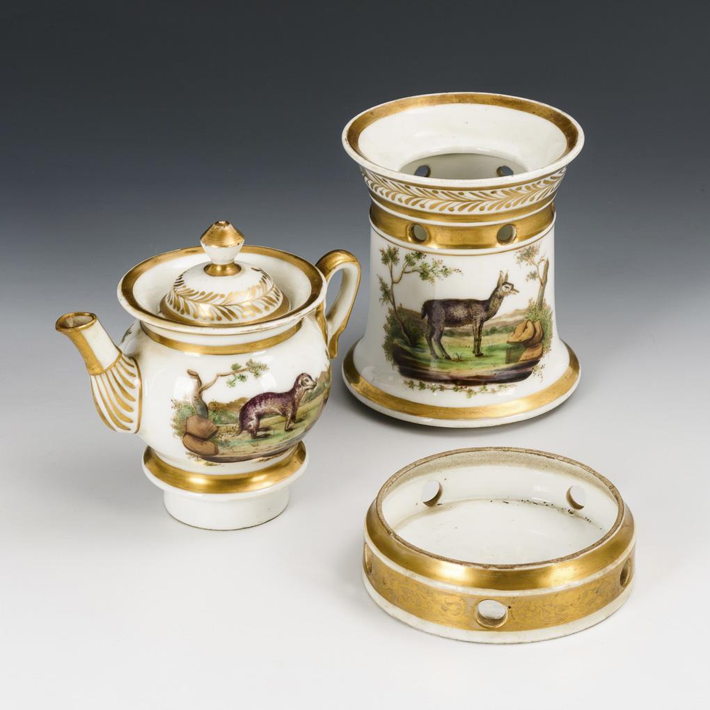 Teapot, tall teapot with separate stand. On teapot and teapot each landscape cutouts with animal depictions. Partial gold abrasion, chip on the inner teapot rim.