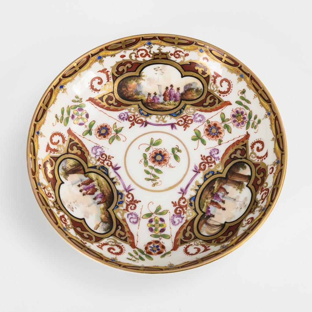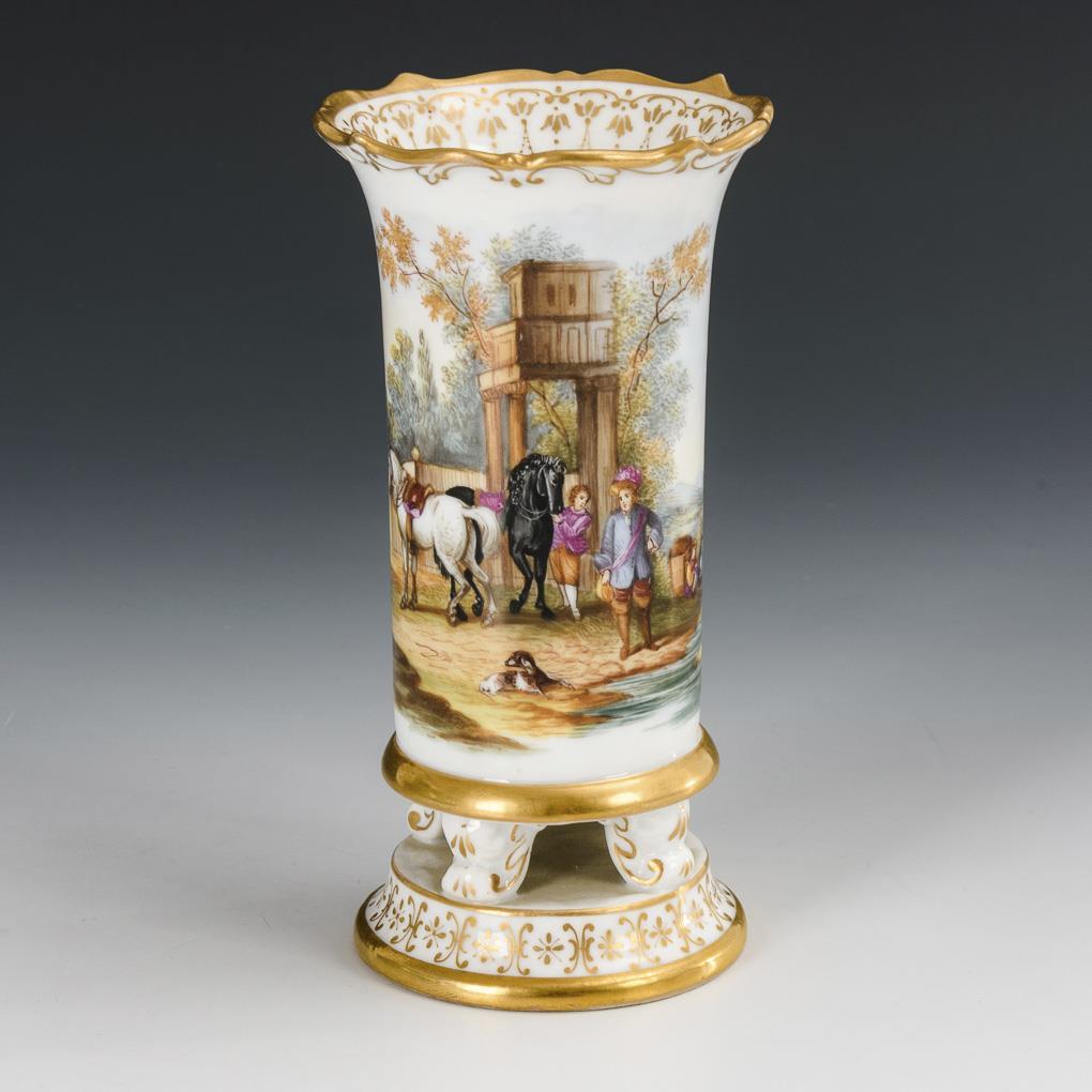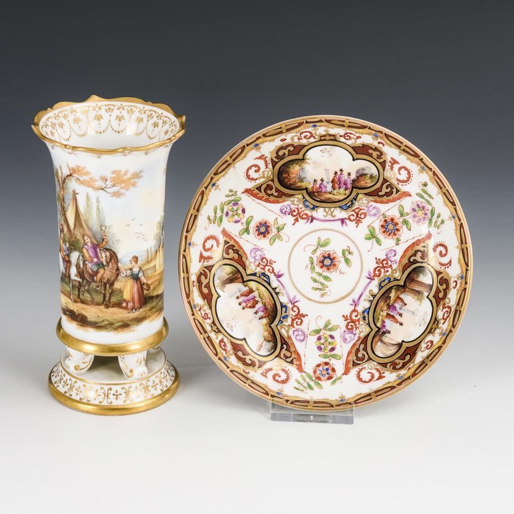1x Helena Wolfsohn, c. 1880: saucer with Kauffahrteimalerei in three four-pass cartouches (Ø 14.5 cm). / 1x bottom marked "Dec. 59 deposé": vase with four feet on round plinth; surrounding the depiction of a landscape with horses, riders and hikers (h 14 cm).