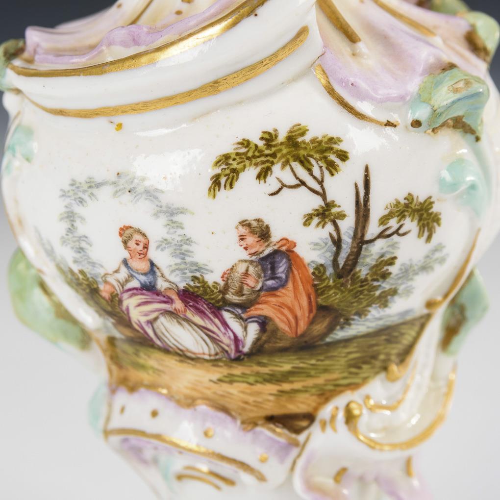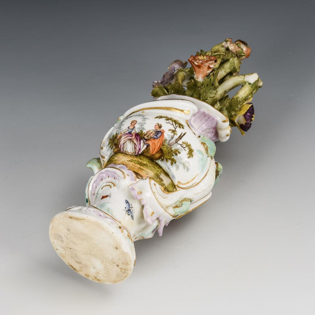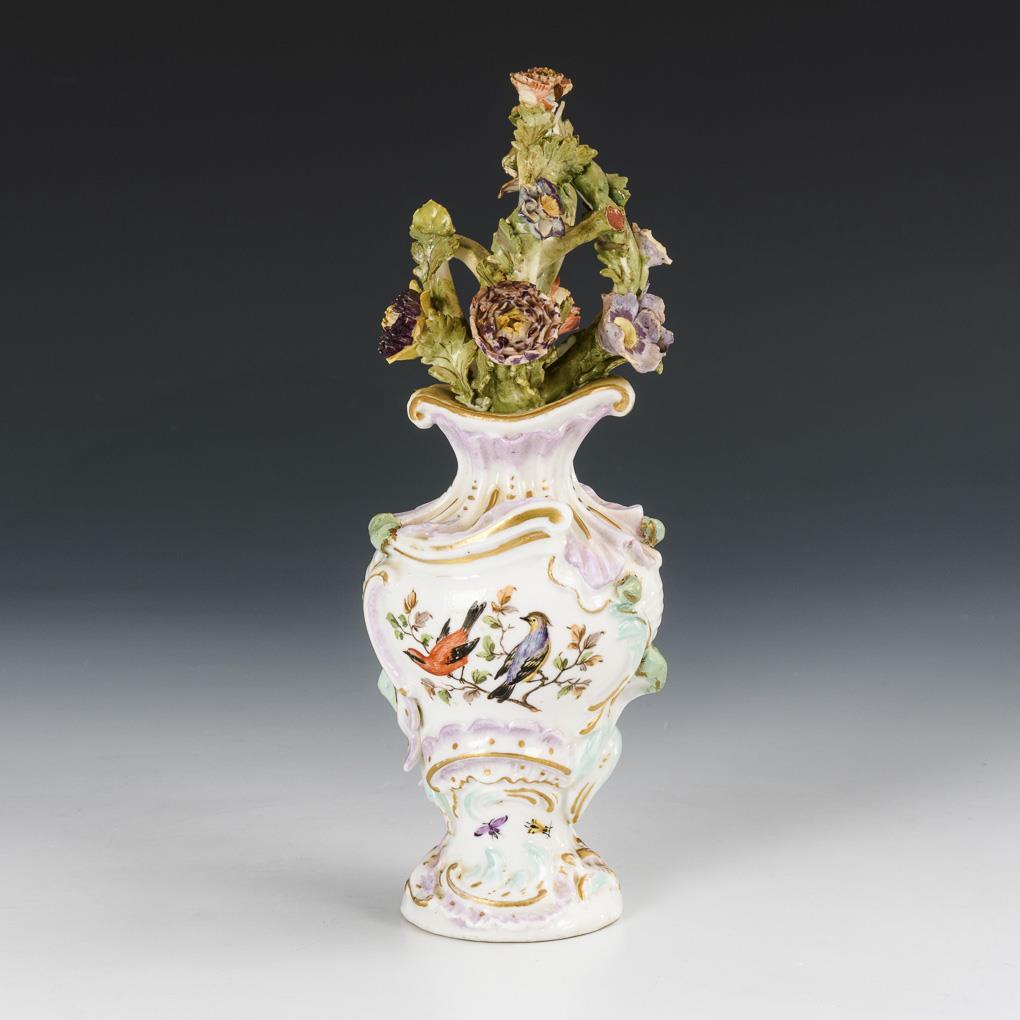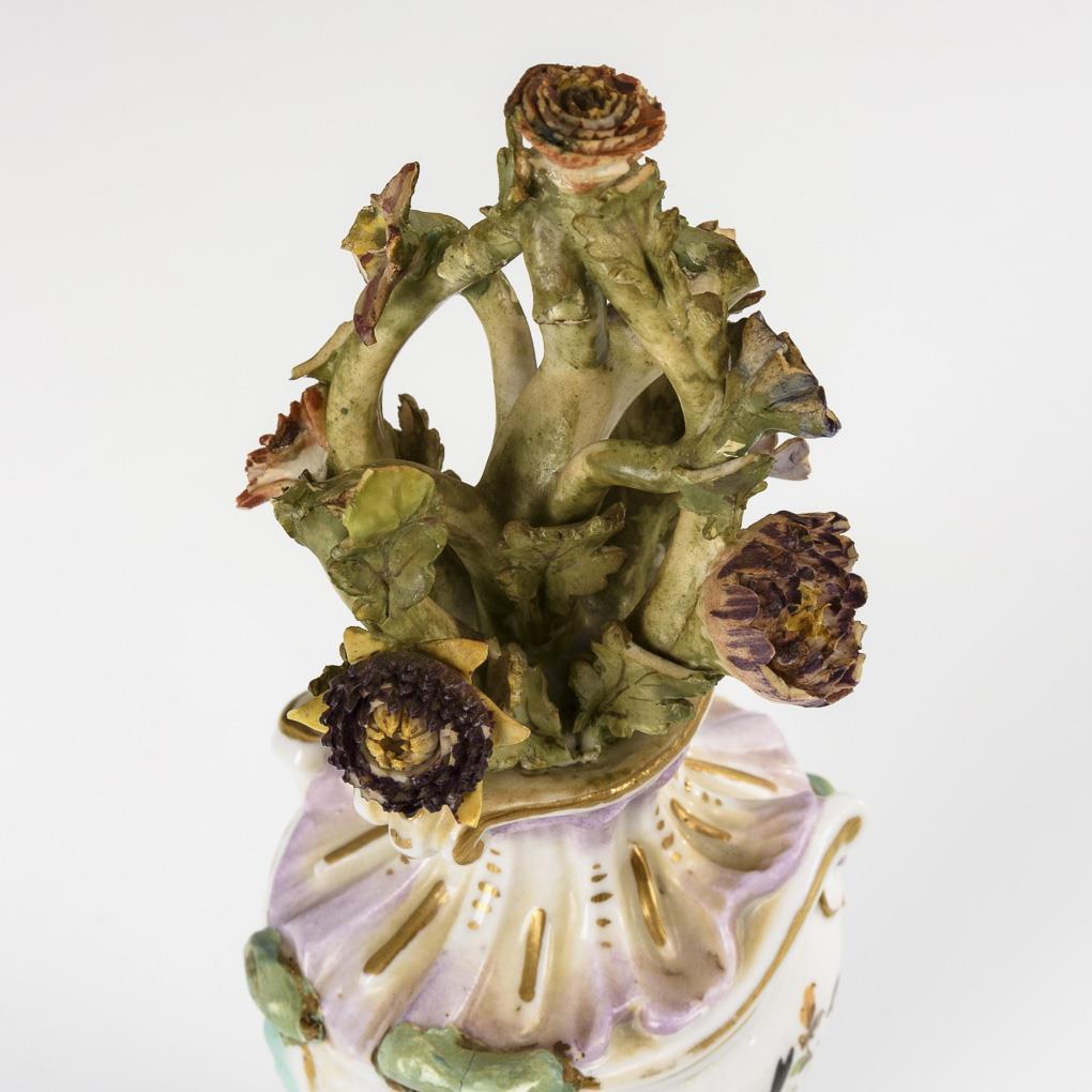 Small baluster vase with rocaille relief and a bouquet of porcelain flowers. On the front a Watteau scene, on the verso bird painting. Flower partly bumped, handle missing, handle heels restored, hairline crack in the neck.