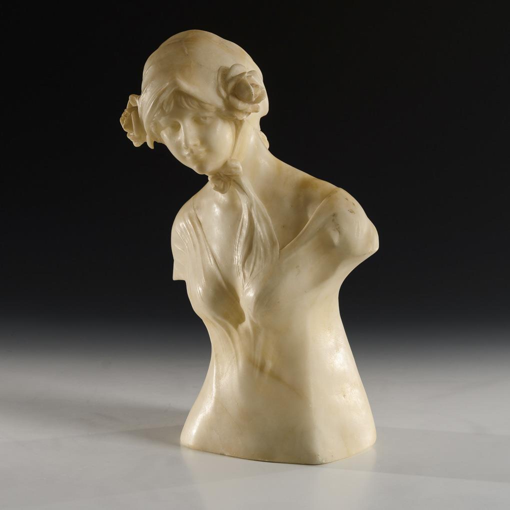 Bust of a young woman with roses at the hood as well as with body-like base. Small missing parts at the roses, otherwise minor signs of age/use.