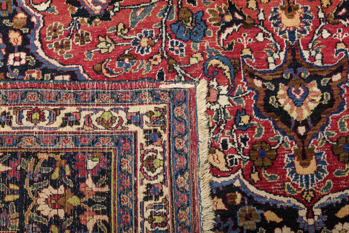 8-panel rosette medallion on curved mirror. Wide, 7-row border with Herati decoration. Lead seal loosely enclosed. Partly strong signs of use and age, defective fringe finishes.