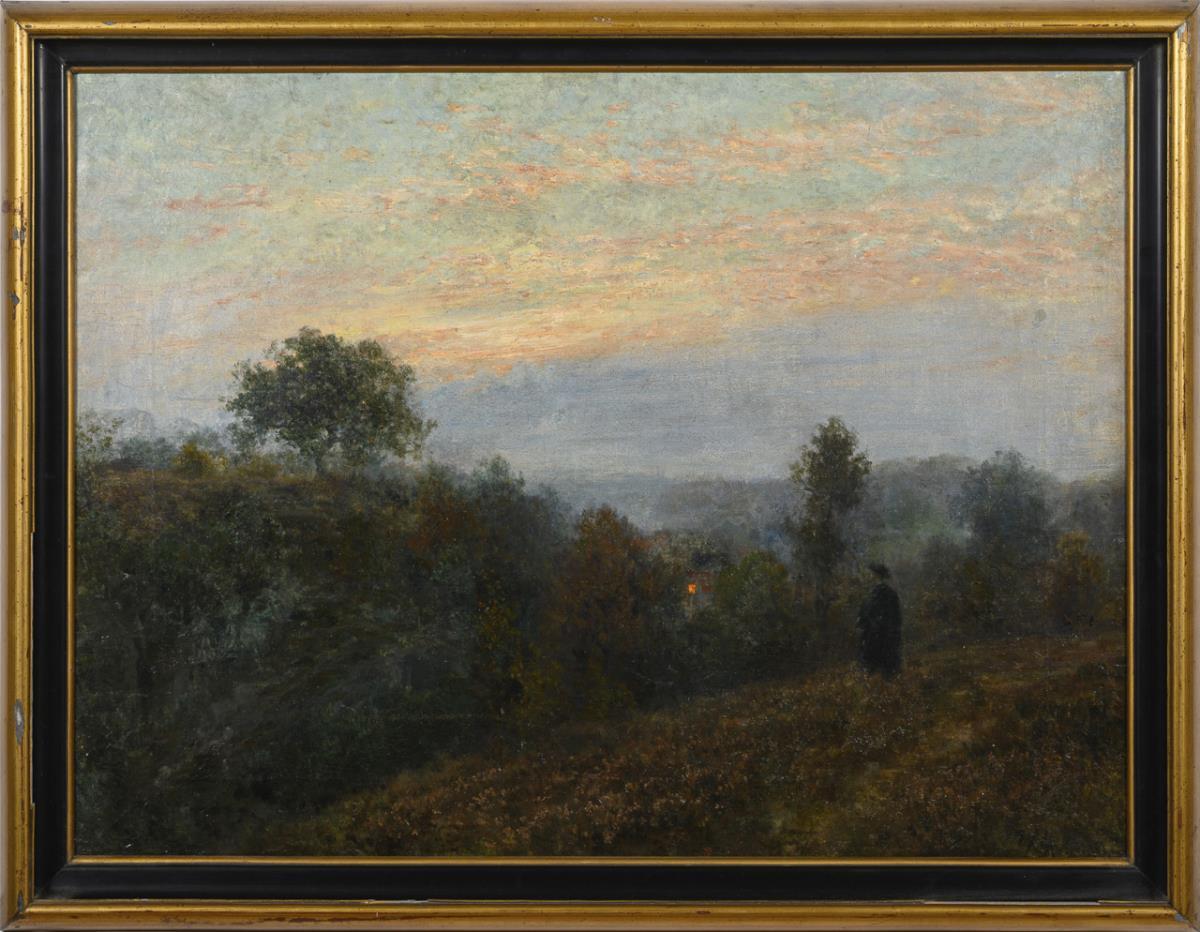Landscape painting reminiscent of Caspar David Friedrich with back figure when looking over the mountainous area in the evening. Light traces of age.