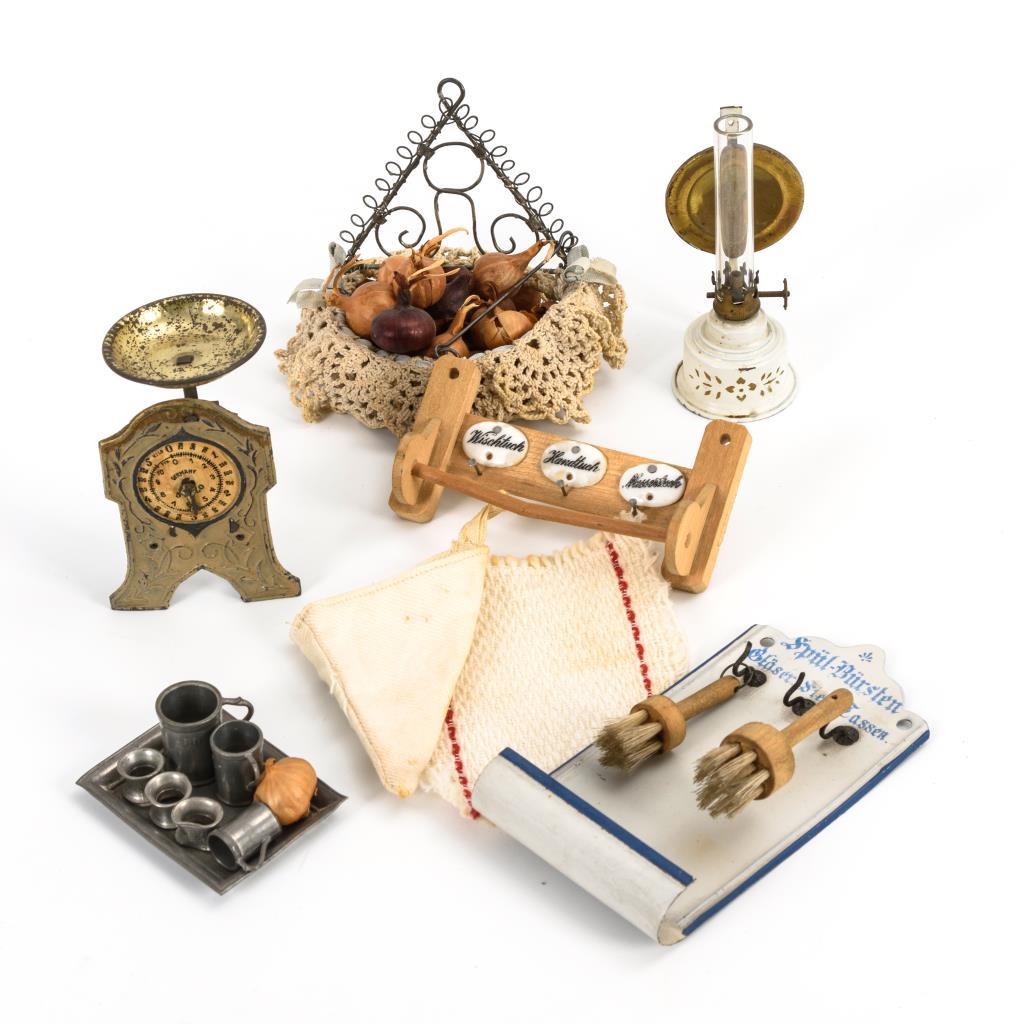Handtuchhalter, Wandblech "Spülbürsten", Waage, Petroleumlampe, Zwiebelkörbchen, Zinnservice. Altersspuren.