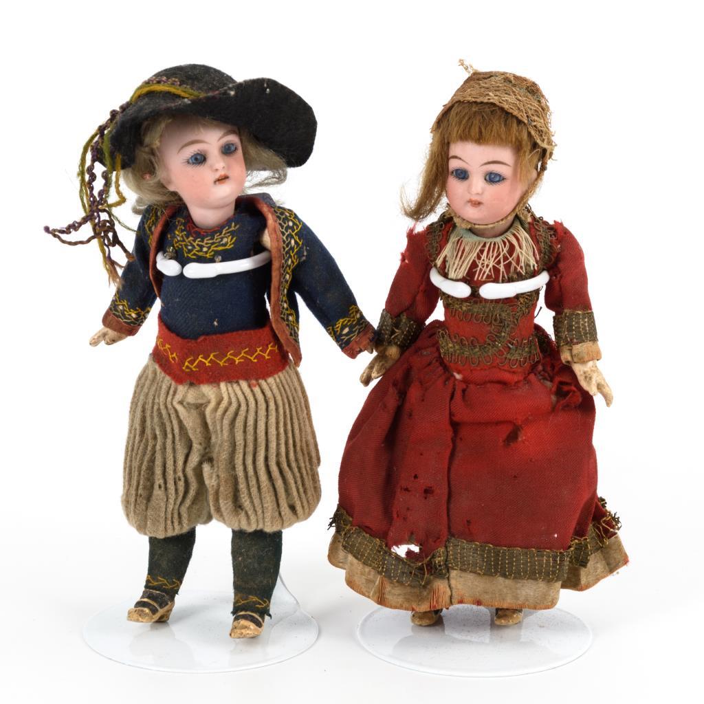 Für die Puppenstube. Beide mit Kurbelkopf, blauen Glasaugen, offenem Mund und Mohairhaaren. Als Mädchen in rotem Kleid, als Junge mit Pluderhose bekleidet. Kleidung partiell zerschlissen, mit Löchern.