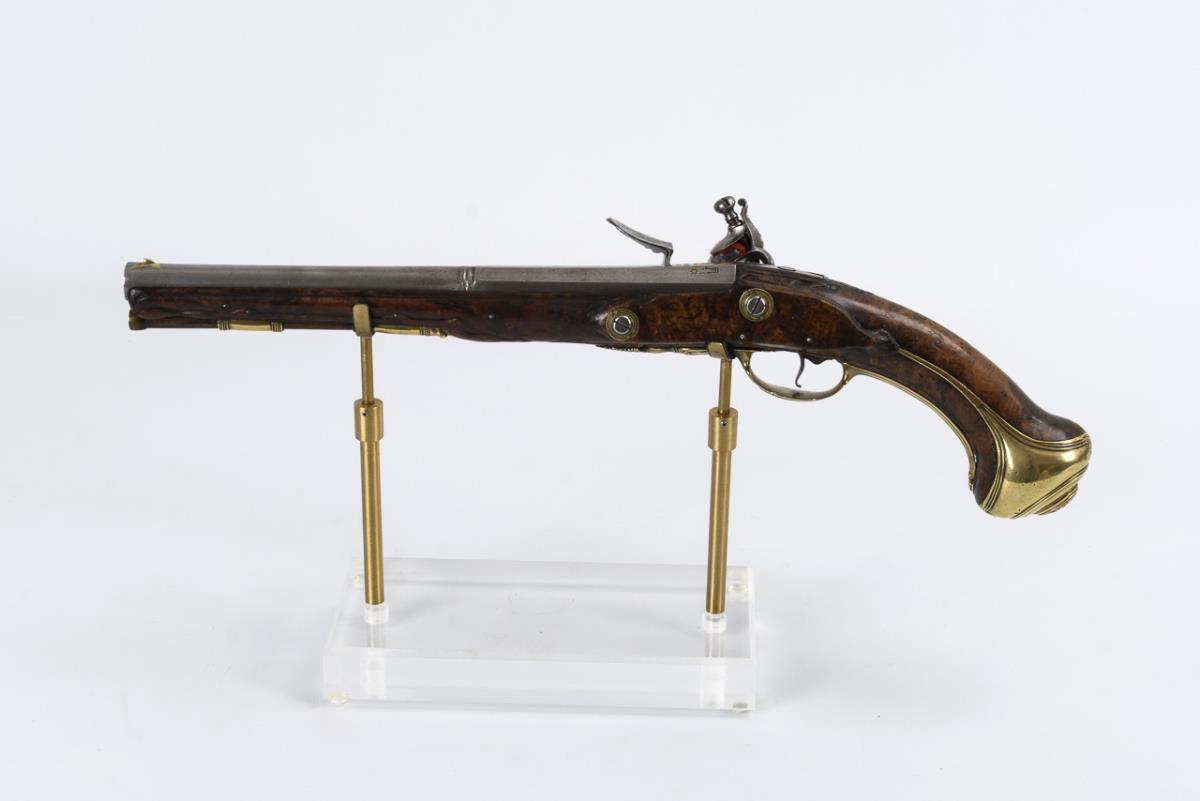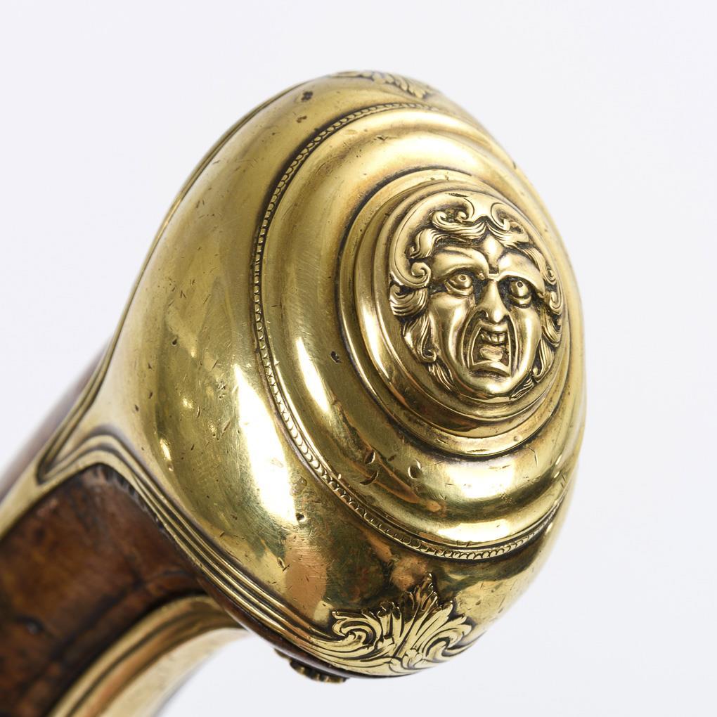 Smooth bore barrel, octagonal in the rear half with inlaid marks. Lock plate with engraved maker's mark. Carved walnut root stock with old, barely visible restorations. Brass mounts with acanthus shapes in relief. Pommel ends in a mascaron. Brass front sight and wooden ramrod. On modern stand.