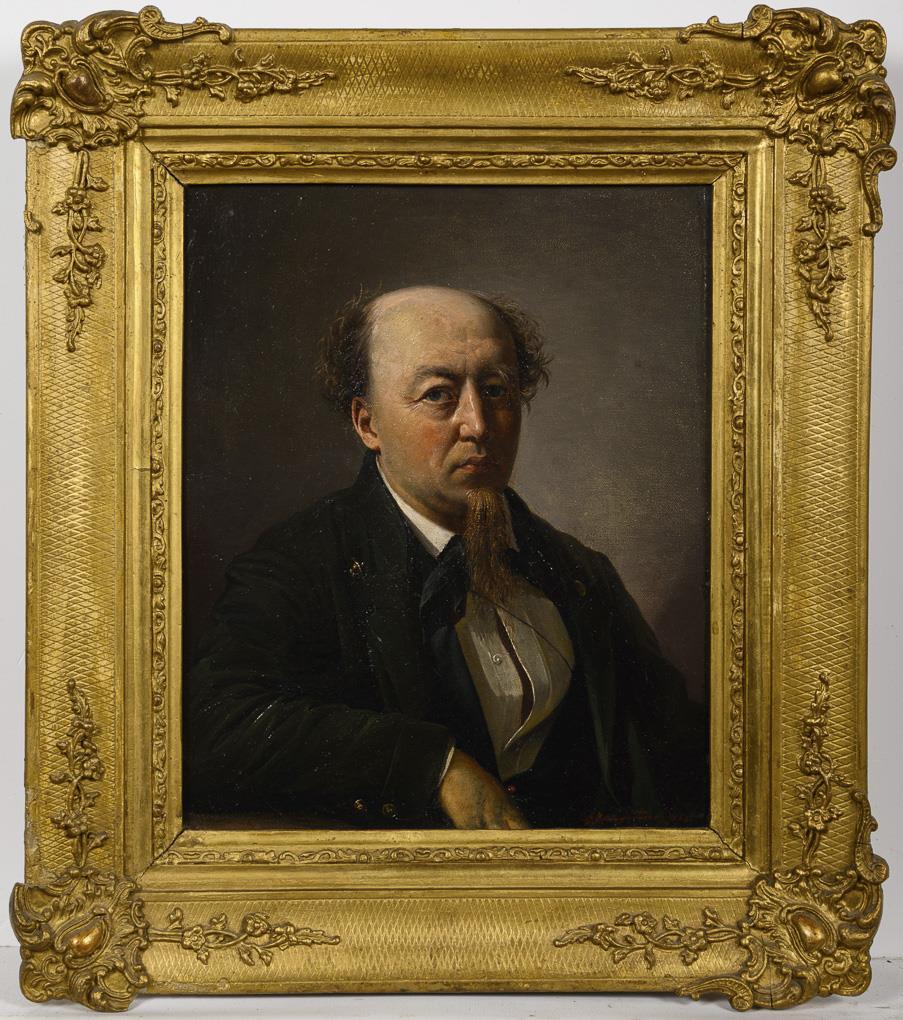 Portrait of a man with long chin beard and in white shirt with green frock coat. Slight signs of age.