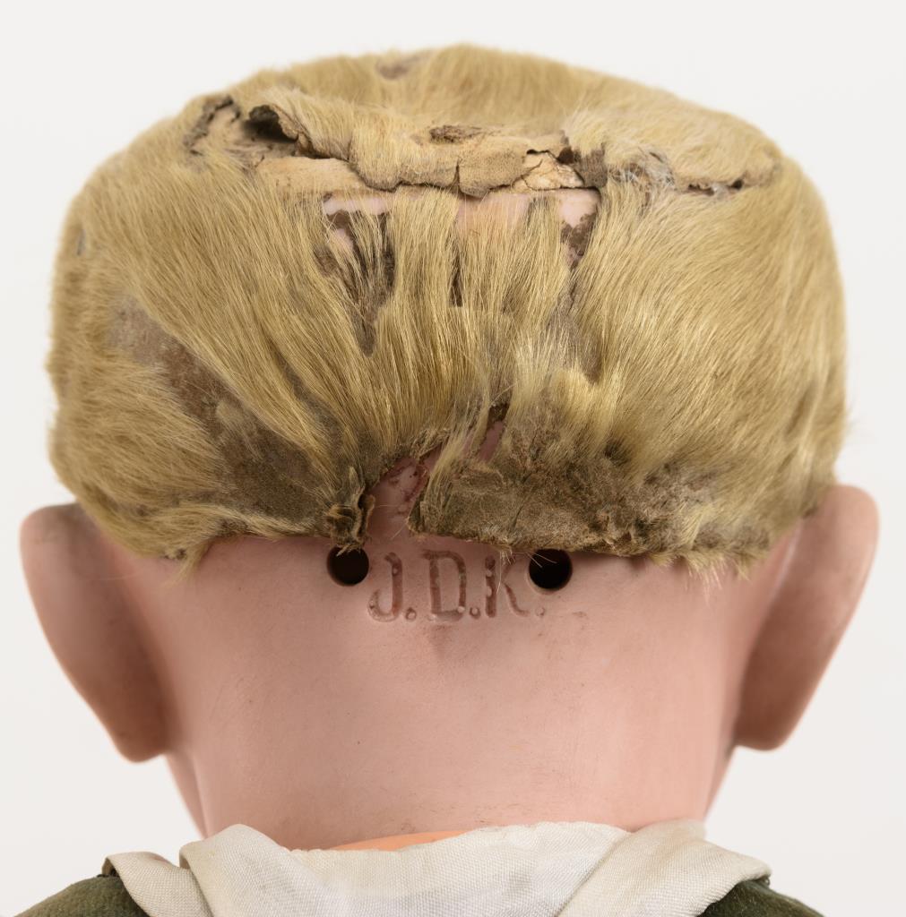 Kurbelkopf, blaue Schlafaugen, offener Mund, 2 Zähnchen, festgeklebte blonde Fellperücke. Späterer Stehbabykörper mit ergänzter Stimme. Grüner Samtanzug, weiße Schuhe. Dazu 1 Holzkreisel. Kopf nicht durchleuchtet, ohne sichtbare Defekte. 1 Finger bestoßen, Stimme verstummt.