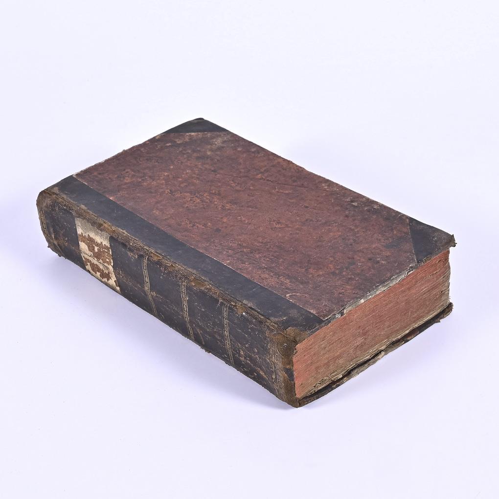 2nd increased and improved edition. 8, 616 pages of text and 12 colored copper plates. Half leather binding, red edges. Only first board torn, outer edges of boards somewhat creased, signs of use, but otherwise firm and good condition.
